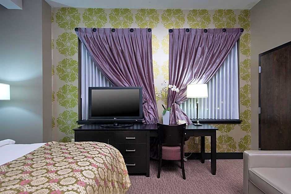 This room has a flat-screen TV, custom chocolates, over sized leather chairs, and a work desk.